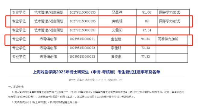 此前,在2025年5月12日,上海戏剧学院官方公布了2025年博士研究生复试名单,网友从中发现了黄晓明,这表明他已通过初试。