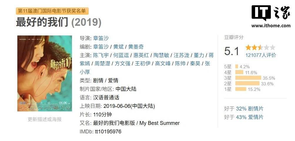 IT之家查询豆瓣获悉,导演章笛沙毕业于中国美术学院油画系和北京电影学院导演系,其先后担任电影《内心引力》《心花路放》《近距离击杀》的编剧,《滚蛋吧肿瘤君》《疯狂的外星人》《侍神令》等电影项目的策划。章笛沙首部导演电影作品《最好的我们》斩获 4.17 亿票房,豆瓣评分只有 5.1。